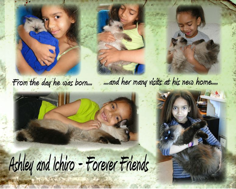 Ichi was a show stopper from the very beginning, his dark points contrasted dramatically with his amazing sapphire blue eyes. His uniqueness was recognized early on by Margret’s young daughter, Ashley. She doted on him from the very beginning, played with him every day and even carried him around in a pink blanket. It was a bittersweet moment when the time came for Ichi to go home with us because we knew that Ashley was going to be very sad. This was confirmed when we heard that she had cried after we left with Ichi. I thought on the situation and came up with an idea. Firstly, we arranged for Ichi to “send” her a card telling her how much he loved her, secondly, I told Margret that Ashley was welcome to visit Ichi at our house any time she wanted to see him. This has led to the establishment of the Ashley-Ichi play date. Every few months, Margret and Ashley come to my place for a visit. Ashley plays with Ichiro and Margret takes her amazing pictures of both Carmen and Ichiro. I get caught up with the happenings at Frosty Forest and generally get to “talk cats” with Margret. What a nice solution to a difficult situation! In addition, I’ve also had the pleasure of getting to know the darling, smart and talented Ms. Ashley. (She is bound to have her own dance company one day!) As for Ichiro himself, he has grown from a darling three pound kitten to 13 pounds of Siberian cat beauty. He is the most docile cat I’ve ever had and certainly, the only one I’ve known that likes getting his belly rubbed. He is shyer and less social than Carmen, but he loves his family and his dinner with all of his heart. He loves to stretch out on our bed at night and will purr if anyone speaks to him or pets him! Carmen and Ichiro have been a great blessing in our lives, we are fortunate to have the company of such loving, beautiful and intelligent cats. Margret is an exemplary breeder and person! I recommend Frosty Forest Siberians without hesitation to anyone wishing to bring one of these stunning cats into their lives.
