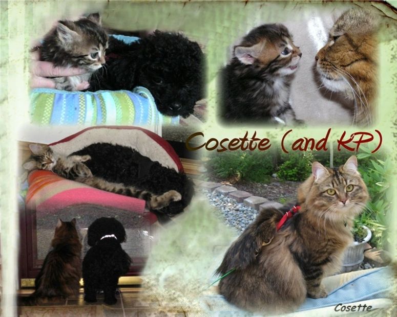 In April of 2012, our dear, beautiful black/brown mackerel tabby, Cosette had her second birthday. She weighs in at 13 lbs. We raised her with her adopted brother, a Shichon at 20 lbs., named KP. They are very affectionate to one another. Cosette grooms KP whenever she thinks he needs it. She pins him down and he knows to hold still until she is satisfied with her job. Whenever we play ball with KP, Cosette joins in the fun. She loves to “hide” behind curtains, or anything three inches tall or more. She leaps out from her hiding place and catches or swats at the ball with one, two or all four paws. KP then has the duty to collect the balls before the next round of fun. Cosette loves to race through the house and leap up on her tower and then straight to the upper window ledge at eight feet. She has an amazing “growl” when she does this. Scratching furniture has never been a problem, she uses her posts. She loves to be brushed and begs to go outside on her leash. Cosette is a ferocious bee swatter and enjoys the taste of her kill. She doesn’t like to be told NO, when she is told no, she changes direction immediately and pretends that she had other things on her mind. She recognizes the word no, treat, outside, hungry and eat. She can come to her name, but only if it is in her best interest. She begs for popcorn (eats it if you hand feed her fluffy pieces) her favorite human snack is cashews. Her brother, the dog, has taught her that begging has its rewards. If I had to mention any negatives, it is that she likes to eat my beautiful wire ribbons. I have to keep them out of her reach.