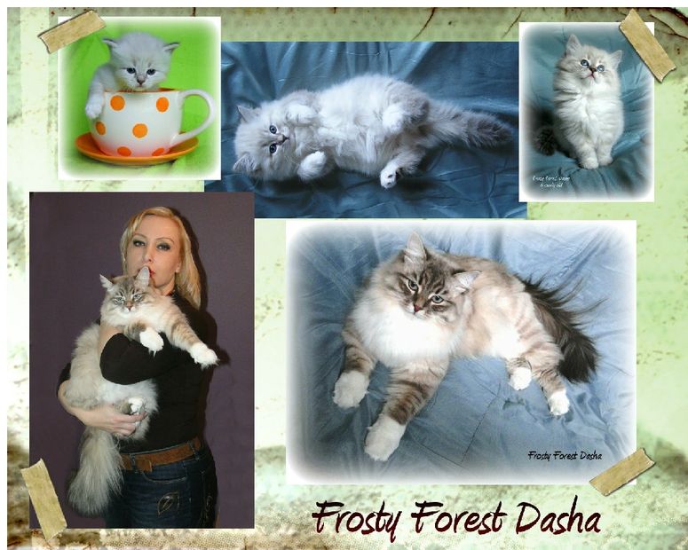Dasha came to us rather unexpectedly while we were waiting to adopt a male kitten from the “I” litter at Frosty Forest. Dasha had been returned to Frosty Forest by a family who couldn't keep her any longer. Margret posted an ad on her website for this beautiful 1-1/2 year old lynx point Siberian female. Her parents are Rico and Zemlianika. We made arrangements to meet Dasha and fell in love with her right away. We adopted her and it didn’t take her long to settle in and become one of the family. We are so happy to share our home with Dasha. For a cat, Dasha exhibits some very dog-like traits, as she follows me around the house where ever I go. She likes to help me fold the laundry and will sit right in the middle of the clothes. When I come home from the grocery store, a paper grocery bag is her favorite hiding place while I put things away. She knows her name and comes when she’s called. When I get up in the morning, she’s there to greet me at my bedroom door and joins me in the bathroom while I wash up. When I come home from work at night, even though my husband is home during the day, she’s sitting by the front door waiting for me. Dasha has a very quiet voice and rarely meows unless she wants to get in a room when the door is closed. Her meow is more like a little chirp. She loves sitting on the back of the couch, draping her arms and legs over my husband’s shoulders. She often will snuggle up to my husband when he’s on the couch. She is not a lap cat, but she is very affectionate and loves being held and scratched on the head and chin. She rolls around on the floor and stretches and loves to have her tummy rubbed when she wakes up. She has a few attention getting antics like chewing on the plants or knocking over waste baskets, but generally she’s a very good kitty. She loves to help with paperwork, and ends up in the middle of things if I walk away for just a minute. Dasha has a very gentle, loving personality. Dasha does like high places and has been trained to stay off counters and tables. Dasha is a strong, sturdy cat. She loves to hunt her favorite bird toy on a wand and will play with it for a long time. She will race around the house at times, chasing imaginary things. Our Dasha is a pleasure and is a valued member of our family. As you can tell from reading this, we love our Dasha and are so grateful to Margret for giving us the opportunity to adopt her."