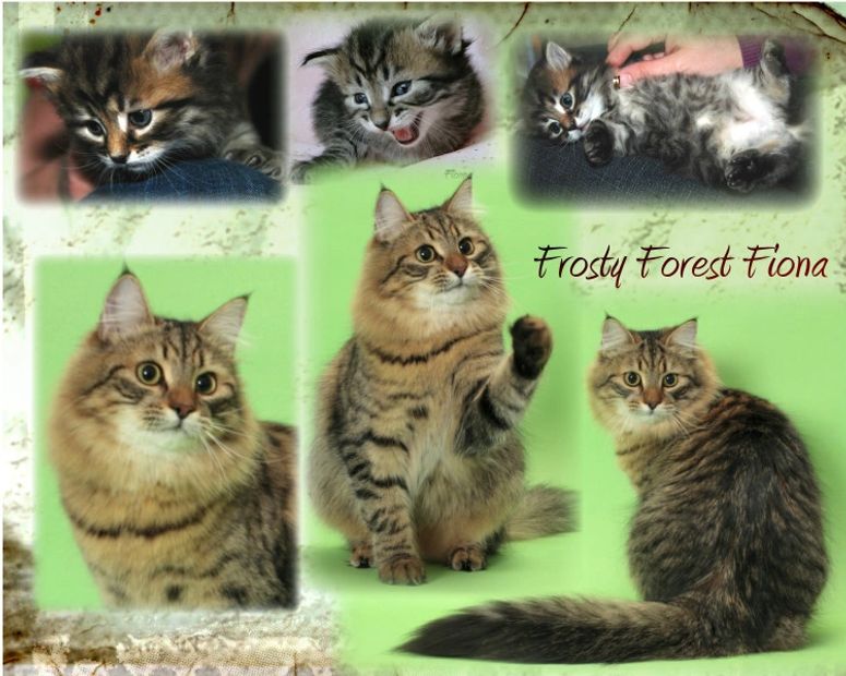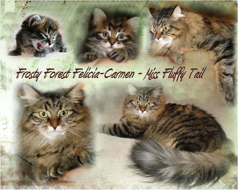 I’ve owned cats for most of my life and the majority of those cats have been Siamese. As our beloved old Siamese boy, Charlie, was reaching the end of his life, we found out that my husband had tested positive for cat allergies. I’d already started the search for a new kitty, but it changed the focus of that search to finding a hypoallergenic breed. I researched the Siberians on the Internet and liked what I read. They were a strong, healthy natural breed who had indeed originated in Siberia. They were reputed to be highly intelligent and social, just like my beloved Siamese, plus they came in every imaginable color including color point (Siamese markings). Sweet Charlie passed away in late February of 2011 and my search for a local Siberian breeder began in earnest. I was fortunate enough to find Frosty Forest Siberians and quickly placed a deposit on a kitten in the F litter that was due the end of March. I was thrilled to get an email announcing the birth of five healthy black and brown mackerel tabbies on March the 31st! It was in that newborn kitten picture, I first saw kitten who would become a member of my family, Felicia Carmen. Three months later she came home with and quickly made her presence known in our household. I was used to smart cats, but her intelligence far exceeded anything I’d ever seen in fifty years of cat ownership! She was playing fetch with me one day and dropped the ball about a foot away from me. I told her, “You need to bring your ball right to me if you want me to throw it”. Immediately, she picked up her ball and carried to my hand! She also recognizes computer icons that resemble one another; she has patted the caret icon next to Facebook pictures with her paw. I’m sure that she thought it was the mouse pointer icon that chased with her paw. Of course, she turned her smarts to mischief, too. We learned quickly to keep toilet lids down as Ms. Carmen also liked to drop full rolls of toilet paper in the potty!