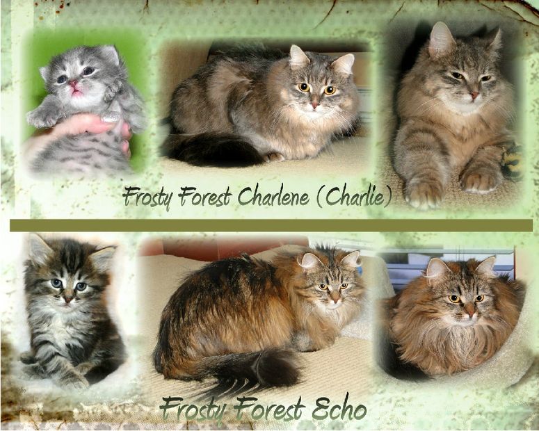 Lianne purchsed 2 kittens from our cattery. First Charlie (Charlene) and a few months later Echo. After Lianne got her first girl and she was waiting for Bastet's litter (and her 2nd kitten) to be born, she wrote in one of her emails "What colors do you think you will get from Bastet? While the brown classic tabby really appeals to us, after having Charlie we realize that she could be purple with pink poke-a-dots and we would still adore her! Their intelligence and loving personalities are really what make Siberians so special (that and how amazingly soft she is!) We would still be interested in a female. We would very much love to have another Frosty Forest kitten!" By the way, she did get a black/brown classic tabby from Bastet's litter, namely Echo. " 2 years later she wrote: "As you know, they couldn't be more different! Charlie is so relaxed and loves everyone she meets. Echo is a "going concern". She is very curious and smart and takes the world on her terms. They are both very affectionate and deeply involved in every aspect of our family life. Although Echo is a bit of a nervous traveller, they both have adjusted to the 2 hour car rides from our home in White Rock to our home in Whistler. It would seem for them, wherever we are, home is! I would recommended the Siberian breed to anyone looking for an amazing feline companion!"