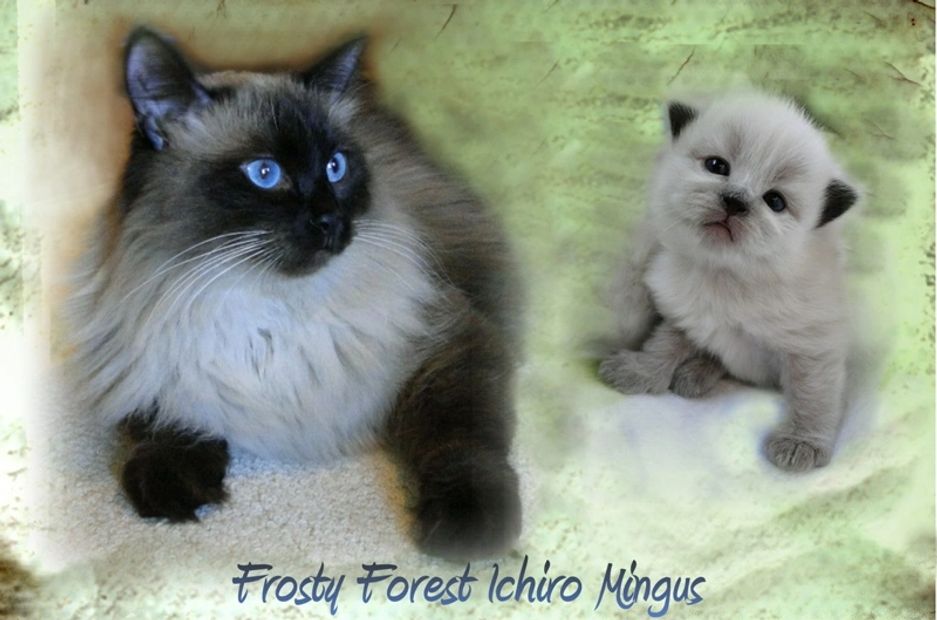 I’d always intended for her to have a kitty companion, ideally a color point Siberian. A month or so after Carmen came home, I found out that Margret’s lynx-point queen, Zemi, was expecting a litter of color-point kittens with Coby, her young lynx-point stud (who was also Carmen’s father). In early October, Zemi had three little color point males. I had first choice of the babies and chose the little boy who was much darker than his brothers. After seeing one set of pictures, I told Margret I was pretty sure that my boy was a seal point, not a lynx point like his brothers and parents. Margret concurred and my boy, Ichiro Mingus, turned out to be the first seal point Siberian born to Frosty Forest Siberians!